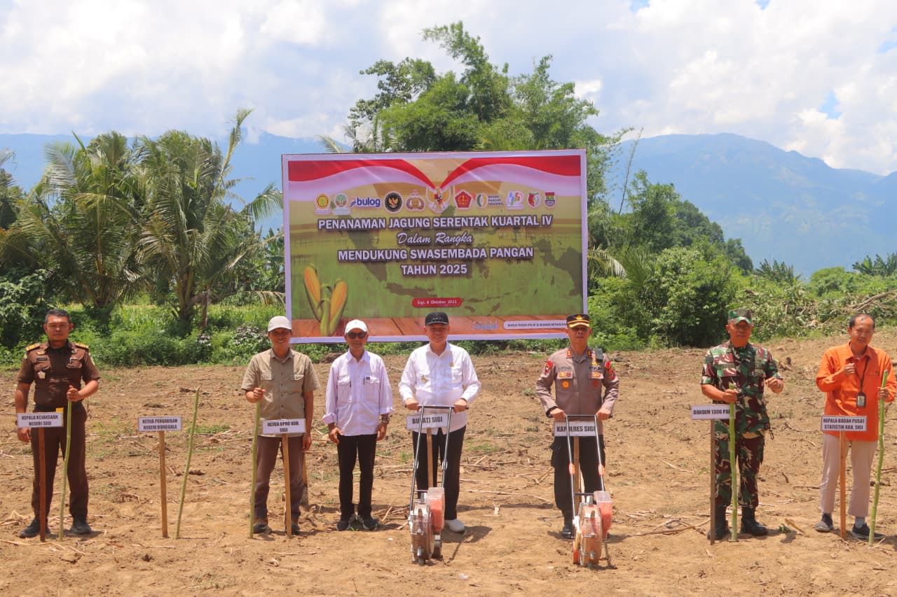SIGI,SULTENG – MEDIA ONLINENEWS.ID//Pabung Sigi Mayor (Inf) Tarno mewakili Dandim 1306/KP Kolonel Yudhi Hendro Prasetyo bersama Bupati Sigi Mohamad Rizal Intjenae, S.Sos., M.Si. dan Kapolres Sigi AKBP Kari Amsah Ritonga, S.H., S.I.K., M.H. mengikuti kegiatan Penanaman Jagung Serentak Kuartal IV yang berlangsung di Desa Bora, Kecamatan Sigi Kota, Kabupaten Sigi, Rabu (8/10/2025) pukul 10.00 hingga 12.00 Wita. Kegiatan ini merupakan bagian dari upaya mendukung program swasembada pangan nasional tahun 2025 yang menjadi prioritas pemerintah.