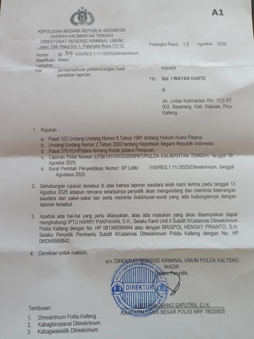 JAKARTA – MEDIA ONLINENEWS.ID//Angga Susanto kini resmi dilaporkan oleh I Wayan Darte di Polda Kalimantan Tengah setelah sebelumnya telah dimintai secara baik-baik untuk mengembalikan uang miliknya.