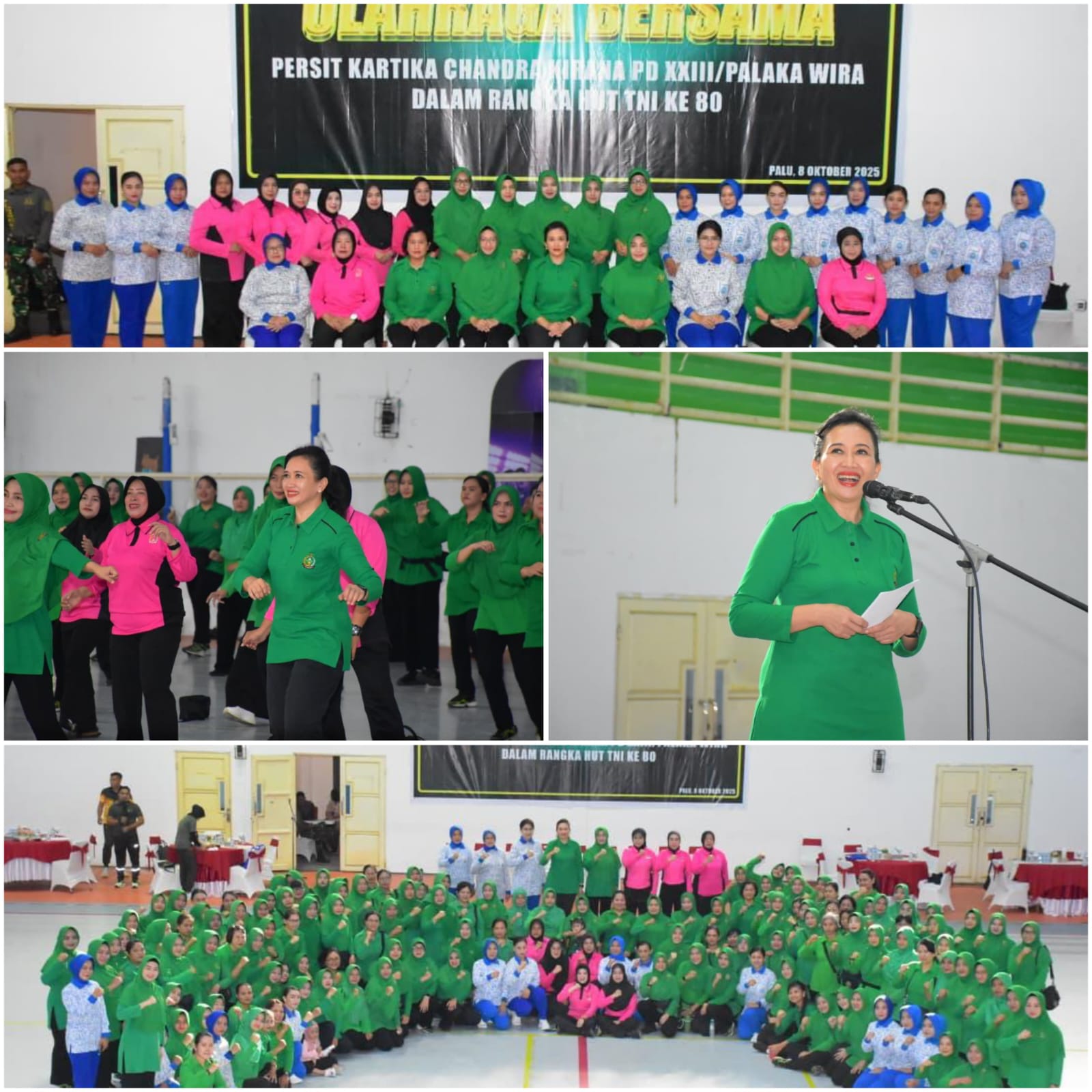 PALU,SULTENG-MEDIA ONLINENEWS.ID//Kebersamaan keluarga besar TNI dan Polri terwujud dalam kegiatan olahraga bersama yang digelar di GOR GBK (Gelora Bumi Kaktus) Palu, Rabu (8/10/2025). Acara yang diikuti tiga organisasi istri prajurit ini menjadi bagian dari rangkaian peringatan Hari Ulang Tahun ke-80 Tentara Nasional Indonesia.