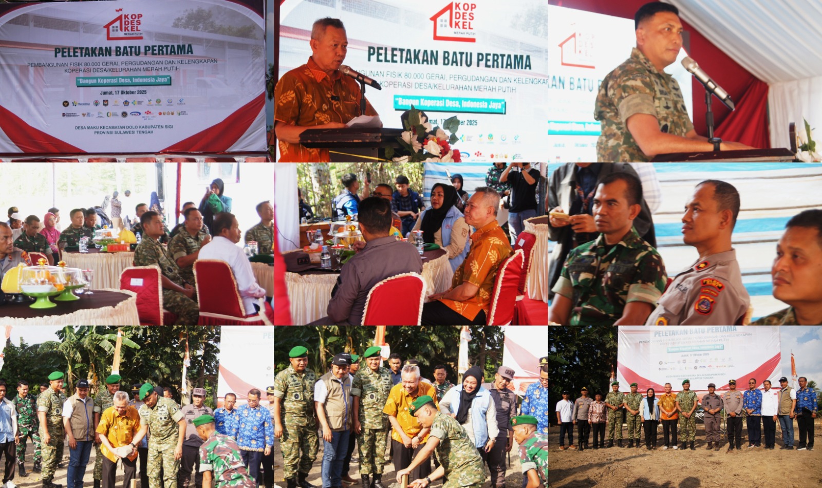 PALU, SULTENG-MEDIA ONLINENEWS.ID//Acara peletakan batu pertama pembangunan fisik 80.000 gerai, pergudangan, dan kelengkapan Koperasi Desa/Kelurahan Merah Putih berlangsung serentak di seluruh Indonesia pada Jumat (17/10/2025), termasuk di Desa Maku, Kecamatan Dolo, Kabupaten Sigi, Sulawesi Tengah. Kegiatan di Sigi dipimpin langsung oleh Pangdam XXIII/ Palaka Wira Mayor Jenderal TNI Jonathan Binsar Parluhutan Sianipar bersama Bupati Sigi Muhammad Rizal Intjenae dan jajaran Forkopimda setempat. Acara berlangsung setelah mengikuti video conference dengan kegiatan utama di Jakarta.
