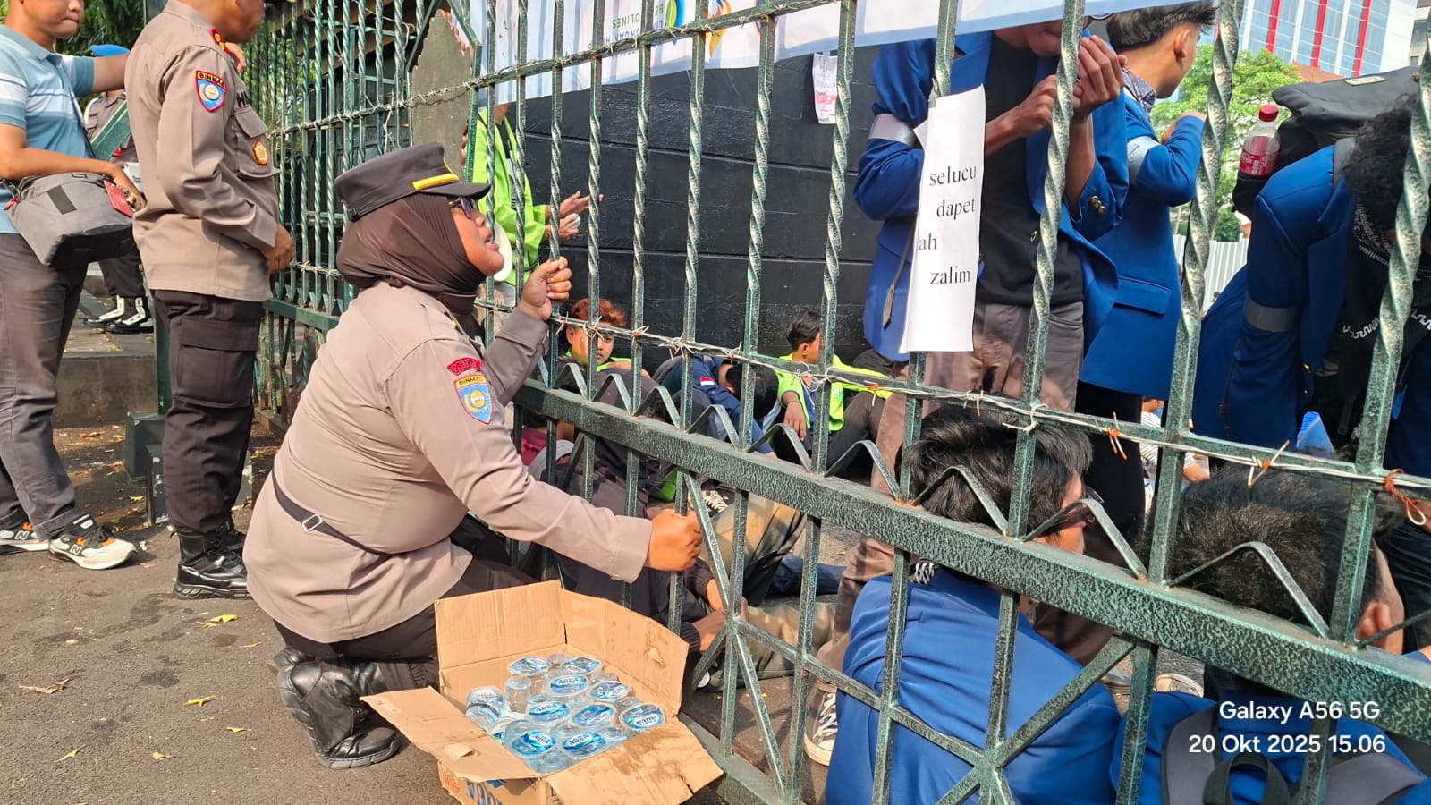 Momen humanis juga tampak ketika Polwan negosiator berinteraksi hangat dengan beberapa pengunjuk rasa dari balik pintu gerbang. Di tengah cuaca yang terik, petugas bahkan membagikan air mineral kepada para pengunjuk rasa agar tidak dehidrasi saat berorasi di bawah terik matahari.