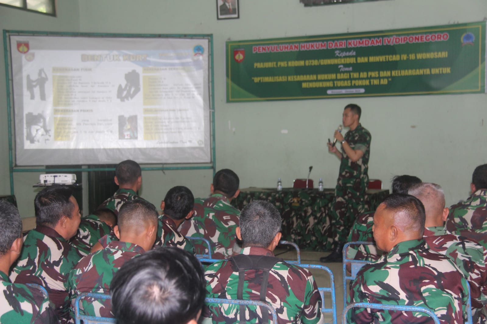 GUNUNGKIDUL (DIY) – MEDIA ONLINENEWS.ID//Komando Distrik Militer (Kodim) 0730/Gunungkidul menggelar kegiatan Penyuluhan Hukum yang disampaikan oleh Tim dari Komando Hukum Daerah Militer (Kumdam) IV/Diponegoro. Kegiatan ini dilaksanakan di Aula Makodim 0730/Gunungkidul dan diikuti oleh seluruh prajurit dan PNS TNI AD Kapanewon Wonosari, Kabupaten Gunungkidul.Rabu,(22/10/2025)