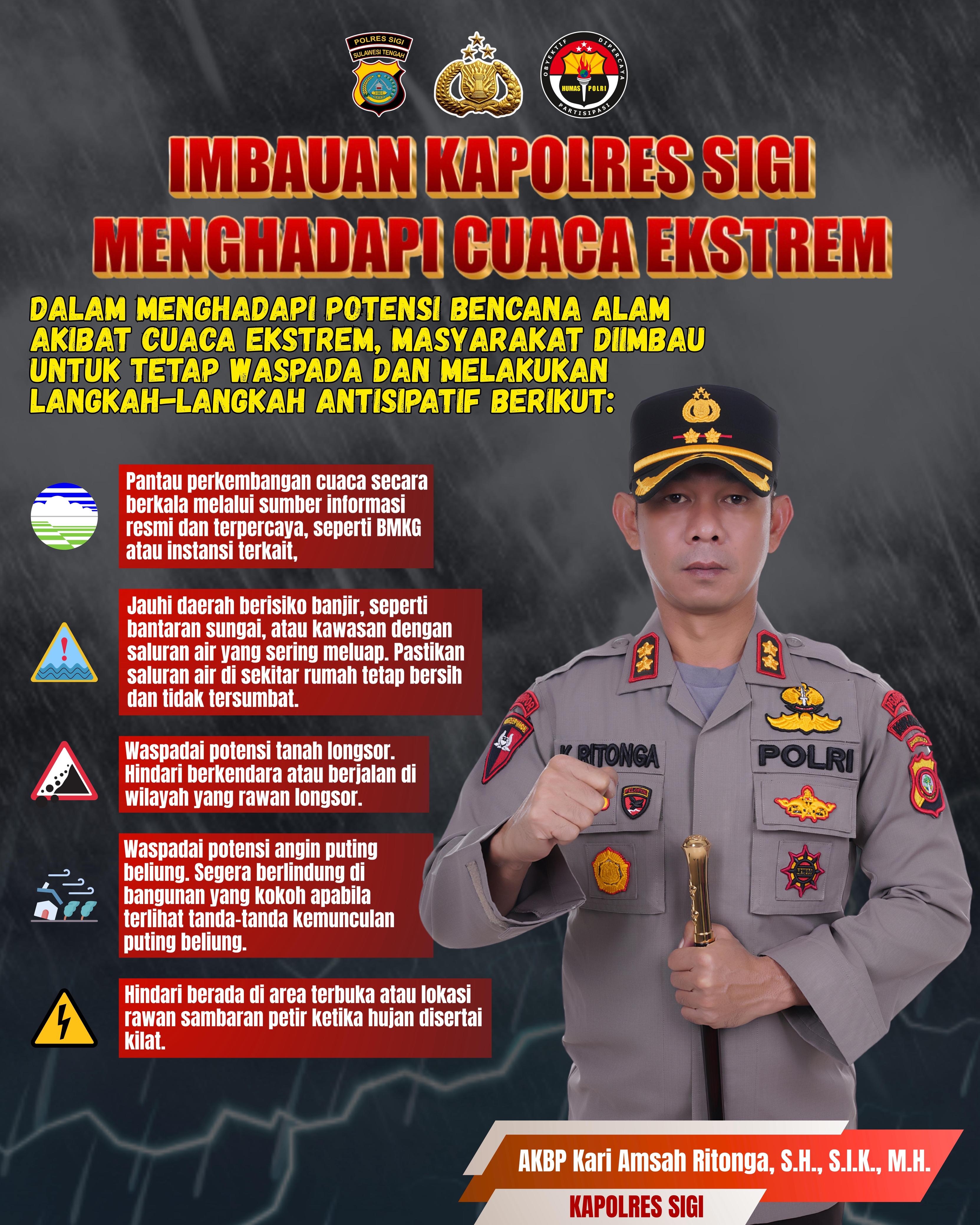 SIGI, SULTENG-MEDIA ONLINENEWS.ID//Menghadapi kondisi cuaca yang cenderung ekstrem, Kapolres Sigi AKBP Kari Amsah Ritonga, S.H., S.I.K., M.H. mengajak masyarakat untuk membangun lingkungan yang lebih aman dan tangguh melalui kesiapsiagaan demi keselamatan bersama.