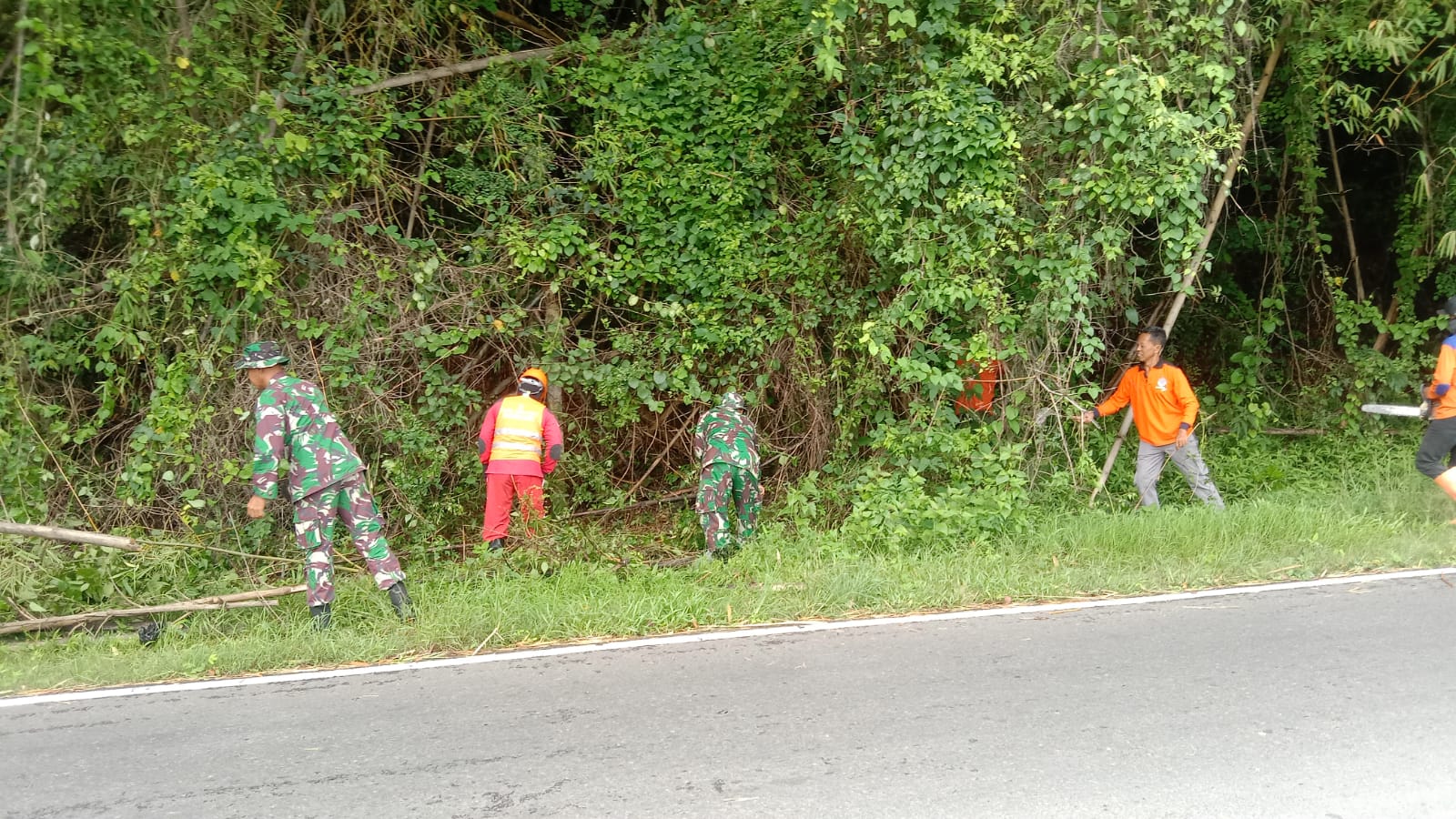 WONOGIRI, JATENG-MEDIA ONLINENEWS ID//Demi Keselamatan Warga masyarakat dan pengguna jalan raya, Komandan Koramil 04/Nguntoronadi Kodim 0728/Wonogiri Kapten Inf Agus Priyanto beserta anggotanya berbaur bersama relawan dari Comandan, Relawan MTA, TAGANA, PMI dan masyarakat menebang ranting pohon yang sudah tua dan membahayakan keselamatan pengguna jalan, bertempat di jalan antar Provinsi tepatnya di Di area Gunung Pegat Ds. Bumiharjo Kec. Nguntoronadi. Rabu (12/11/2025).
