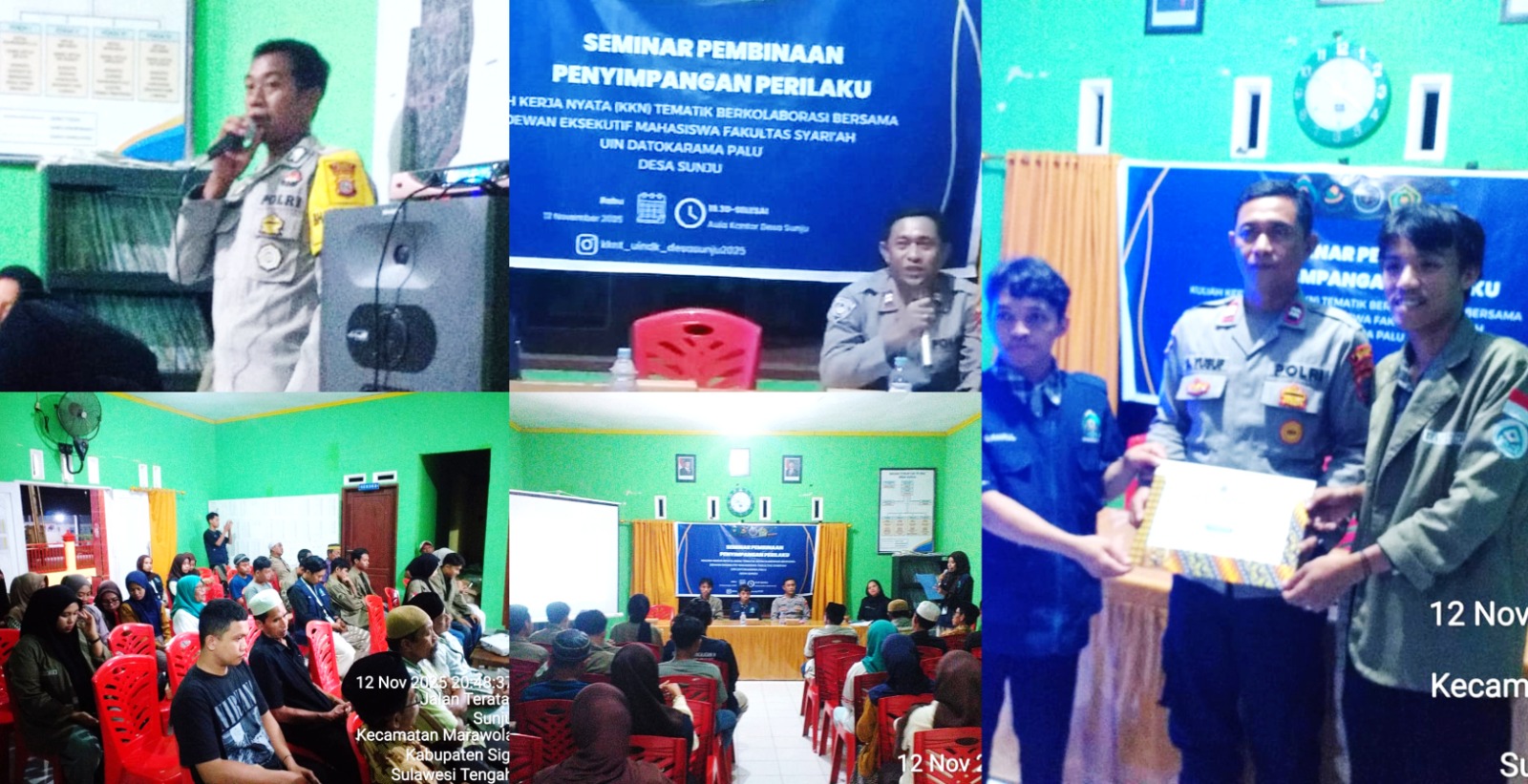 SIGI, SULTENG-MEDIA ONLINENEWS.ID//Kantor Desa Sunju, Kecamatan Marawola, Kabupaten Sigi menjadi lokasi penyelenggaraan Seminar Pembinaan Penyimpangan Perilaku pada Rabu malam, 12 November 2025. Kegiatan ini merupakan kolaborasi antara mahasiswa Kuliah Kerja Nyata Tematik dengan Dewan Eksekutif Mahasiswa Fakultas Syariah UIN Datokarama Palu.