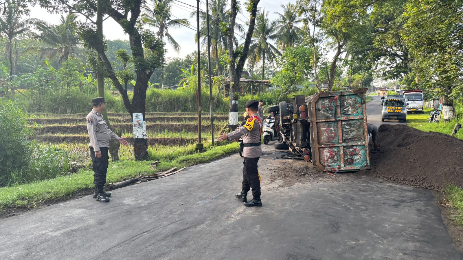 WONOGIRI, JATENG-MEDIA ONLINENEWS.ID//Polres Wonogiri menunjukkan respons cepat dalam penanganan kecelakaan lalu lintas tunggal yang melibatkan truk bermuatan pasir di Jalan Ngadirojo–Nguntoronadi, Dusun Pondok, Kecamatan Ngadirojo, Minggu (16/11/2025) sekitar pukul 05.30 WIB.