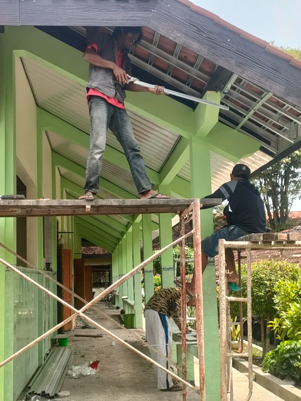 WONOGIRI, JATENG-MEDIA ONLINENEWS.ID//Pekerja konstruksi rehabilitasi gedung SMA Negeri 1 Purwantoro, Kecamatan Purwantoro, Kabupaten Wonogiri, terlihat bekerja tanpa alat pelindung diri (APD) saat Tim Persatuan Jurnalis Wonogiri (PJW) kunjungi lokasi Senin (17/11). Dari 11 pekerja, tak ada yang pakai helm, sarung tangan, atau sepatu safety, langgar Peraturan Menteri Tenaga Kerja Nomor PER.08/MEN/VII/2010 yang wajibkan pengusaha sediakan APD gratis sesuai SNI.
