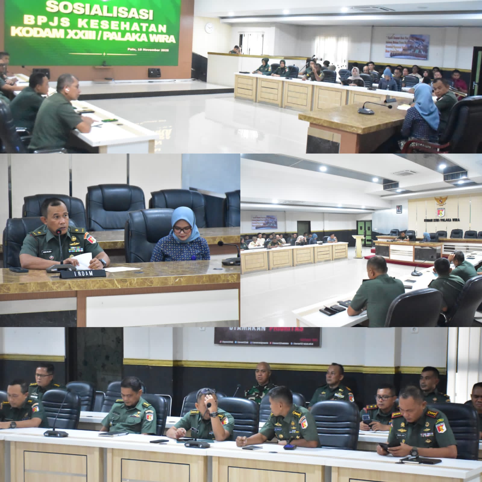 PALU, SULTENG-MEDIA ONLINENEWS.ID//Kodam XXIII/Palaka Wira bekerja sama dengan BPJS Kesehatan menggelar sosialisasi layanan jaminan kesehatan bagi prajurit, PNS, dan keluarga besar Kodam XXIII/Palaka Wira. Kegiatan berlangsung di Aula Songgolangi Makodam XXIII/Palaka Wira dan dipimpin oleh Irdam XXIII/Palaka Wira Brigjen TNI Deni Rejeki, S.E., M.Si., serta diikuti oleh para pejabat utama, prajurit, dan PNS Kodam XXIII/Palaka Wira.(18/11/2025)