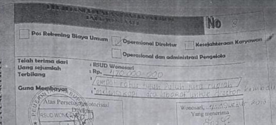 Pernyataan tersebut diperkuat dengan sebuah kuitansi tidak resmi sebesar Rp 470.000.000 bertanggal 4 Agustus 2018, yang dinyatakan sebagai bukti pengeluaran uang kas BLUD RSUD Wonosari.