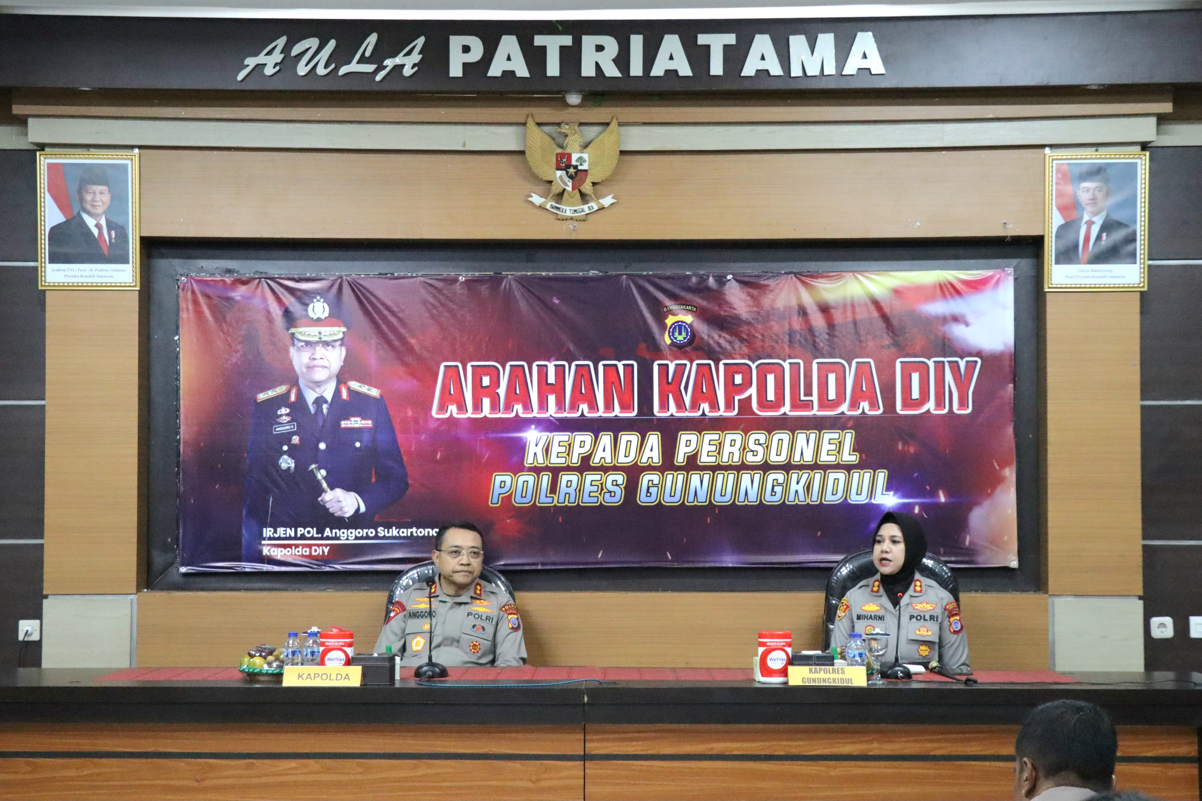 GUNUNGKIDUL (DIY)-MEDIA ONLINENEWS.ID//Kapolda DIY Irjen.Pol Anggoro Sukartono, S.I.K, didampingi PJU Polda DIY diantaranya oleh Dansat Brimob Polda DIY, Dir Samapta, Kabid Propam, Dir Intel dan Dir Lantas Polda DIY, memberikan arahan kepada perwakilan personel Polres Gunungkidul, hadir AKBP Miharni Hanapi, S.I.K., M.M, Kapolres Gunungkidul, Jajaran PJU dan Kapolsek jajaran di Aula Patriatama Polres Gunungkidul, Selasa, 2 Desember 2025.