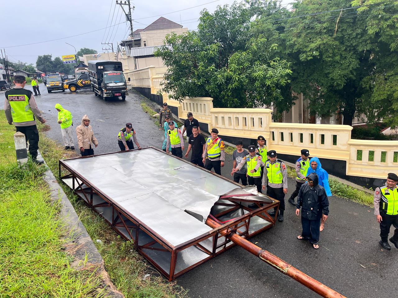 Setibanya di lokasi, petugas melakukan koordinasi dengan Satpol PP dan unsur terkait. Evakuasi baliho dilakukan secara manual dengan melibatkan Pleton Siaga Bhayangkara, personel Satpol PP dan dibantu warga sekitar. Proses penyingkiran berjalan cepat dan badan jalan kembali terbuka sehingga lalu lintas bisa normal kembali.