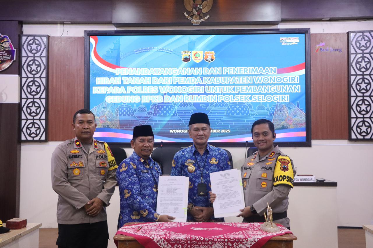 WONOGIRI, JATENG-MEDIA ONLINENEW.ID//Polres Wonogiri menerima hibah tanah dari Pemerintah Kabupaten Wonogiri untuk pembangunan Gedung Satpas BPKB Polres Wonogiri dan rumah dinas Polsek Selogiri. Penandatanganan dan penyerahan hibah tanah tersebut dilaksanakan di Aula Sanika Satya Wada Polres Wonogiri, Jumat (19/12/2025).