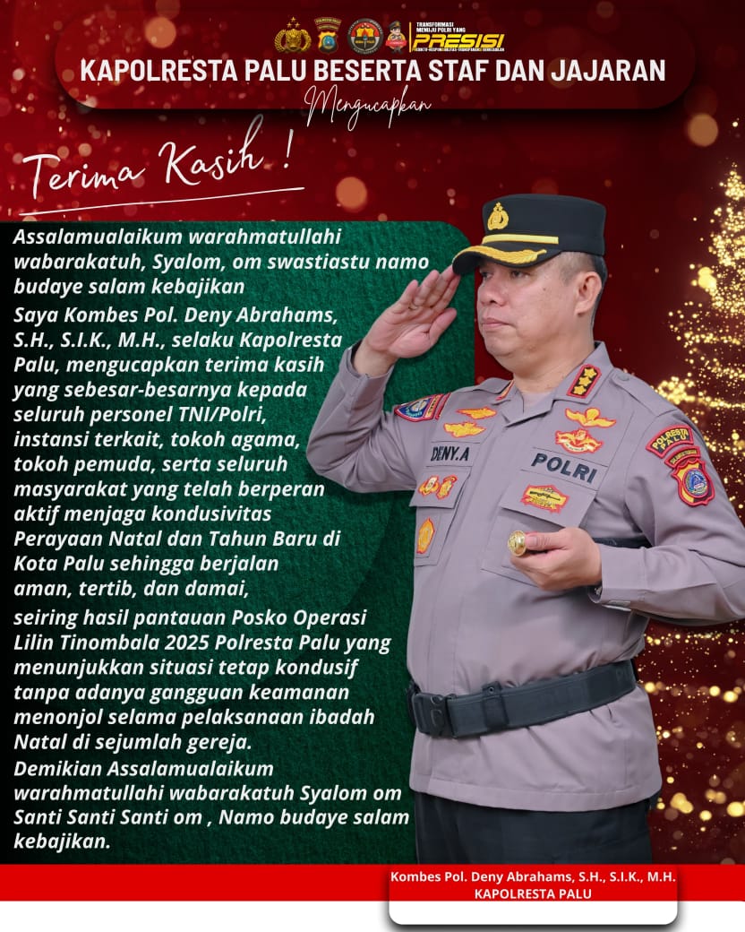 “Hasil pantauan Posko Operasi Lilin Tinombala 2025 Polresta Palu menunjukkan situasi tetap kondusif tanpa adanya gangguan keamanan menonjol selama pelaksanaan ibadah Natal di sejumlah gereja,” tegas Kombes Pol. Deny Abrahams.
