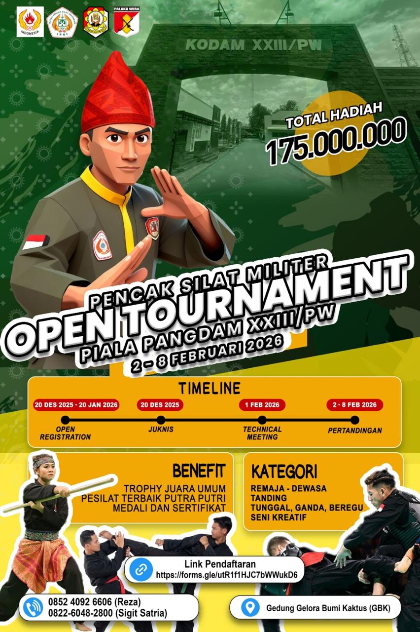Untuk memastikan partisipasi maksimal, panitia pelaksana telah mendistribusikan undangan resmi kepada seluruh Kodam di Indonesia. Kejuaraan Pencak Silat Militer Open Tournament Piala Pangdam XXIII/Palaka Wira dijadwalkan berlangsung di GOR Gelora Bumi Kaktus, Kota Palu, pada 2 hingga 8 Februari 2026.(**) Rif