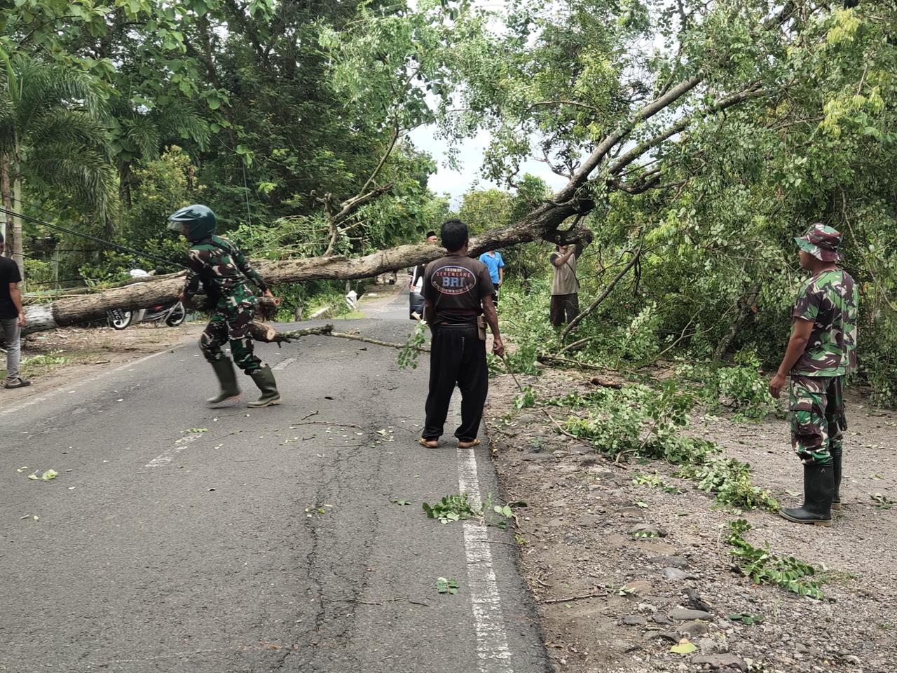 Sebelumnya, Peltu Hadi mendapatkan laporan dari warga, yang kebetulan sedang melaksanakan Piket. Dengan sigap, di bantu oleh warga setempat, Prajurit TNI ini melakukan evakuasi pohon tumbang tersebut dengan alat seadanya.