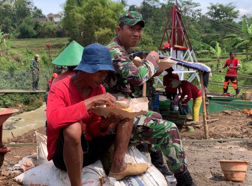 Momen sederhana tersebut menjadi gambaran nyata kemanunggalan TNI dengan rakyat. Tanpa sekat, personel TNI bersama warga duduk dan menikmati hidangan seadanya yang disiapkan secara gotong royong, usai melaksanakan pekerjaan fisik pembangunan jembatan gantung.