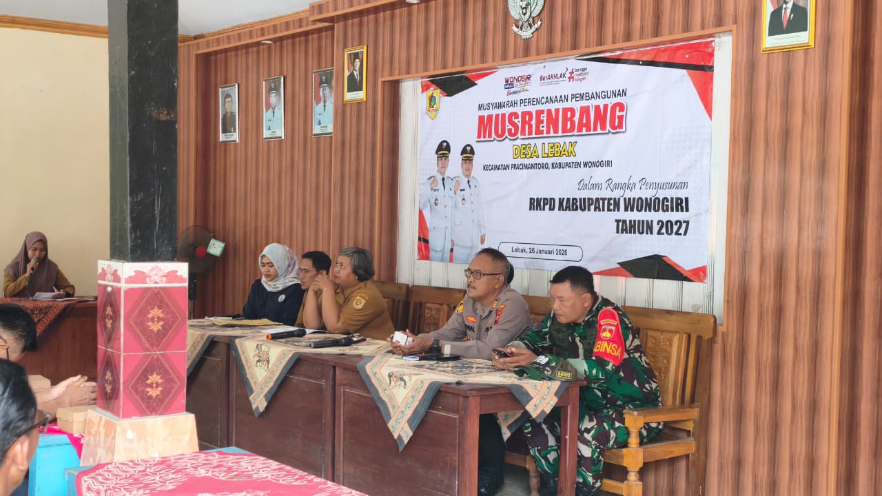 WONOGIRI, JATENG-MEDIA ONLINENEWS.ID//Polsek Pracimantoro Polres Wonogiri menghadiri kegiatan Musyawarah Perencanaan Pembangunan Desa (Musrenbangdes) Tahun 2026 yang digelar di Balai Desa Lebak, Kecamatan Pracimantoro, Senin (26/1/2026). Kegiatan ini menjadi forum strategis dalam penyusunan Rancangan Rencana Kerja Pemerintah Daerah (RKPD) Tahun 2027 tingkat desa.