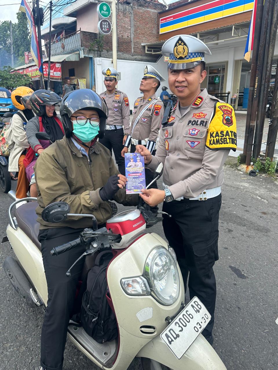 Adapun bentuk kegiatan yang dilakukan meliputi penyampaian imbauan tertib berlalu lintas, sosialisasi kepatuhan berkendara, serta pembagian brosur dan pamflet Ops Keselamatan Candi 2026 kepada masyarakat. Total sebanyak 200 lembar brosur dibagikan dalam kegiatan tersebut.