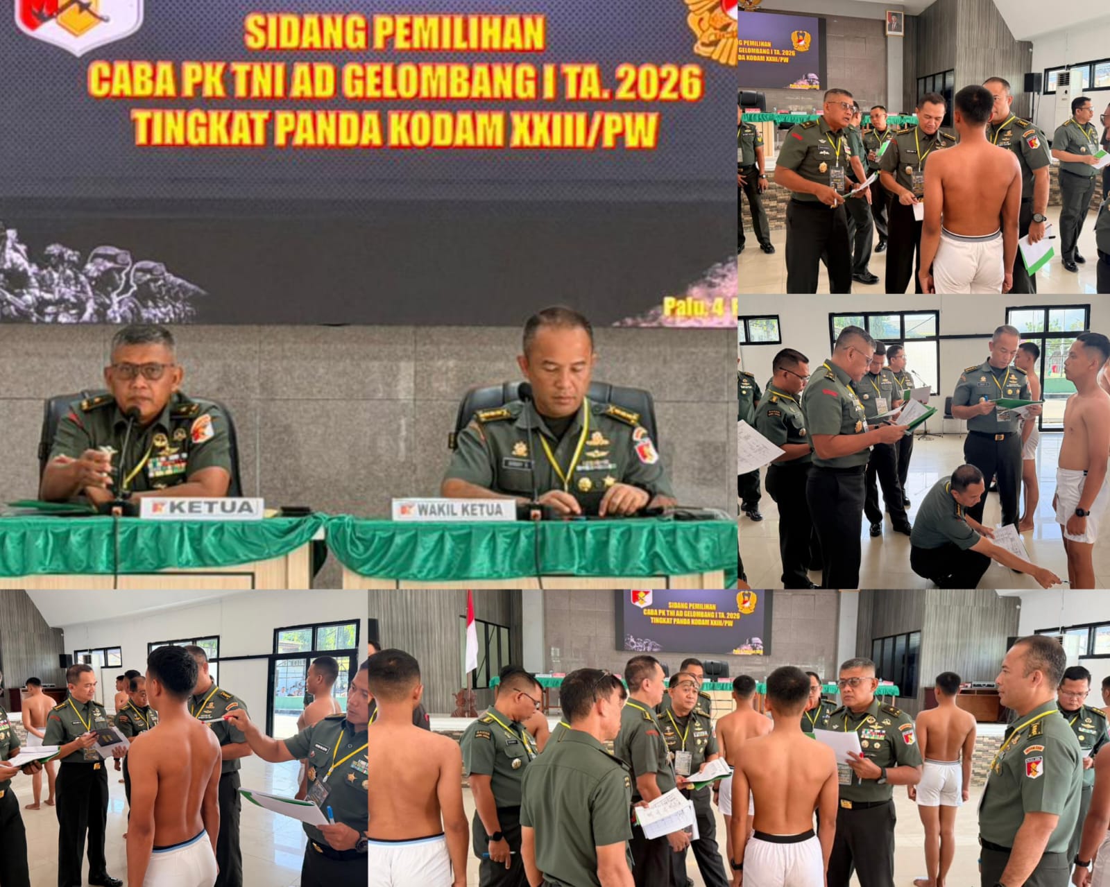 PALU, SULTENG – MEDIA ONLINENEWS. ID//Kodam XXIII/Palaka Wira melaksanakan Sidang Pemilihan Calon Bintara Prajurit Karier (Caba PK) TNI Angkatan Darat Gelombang I Tahun Anggaran 2026 tingkat Panitia Daerah (Panda) Palu, bertempat di Aula Manggala Sakti Makodam XXIII/Palaka Wira, Selasa (4/2/2026).