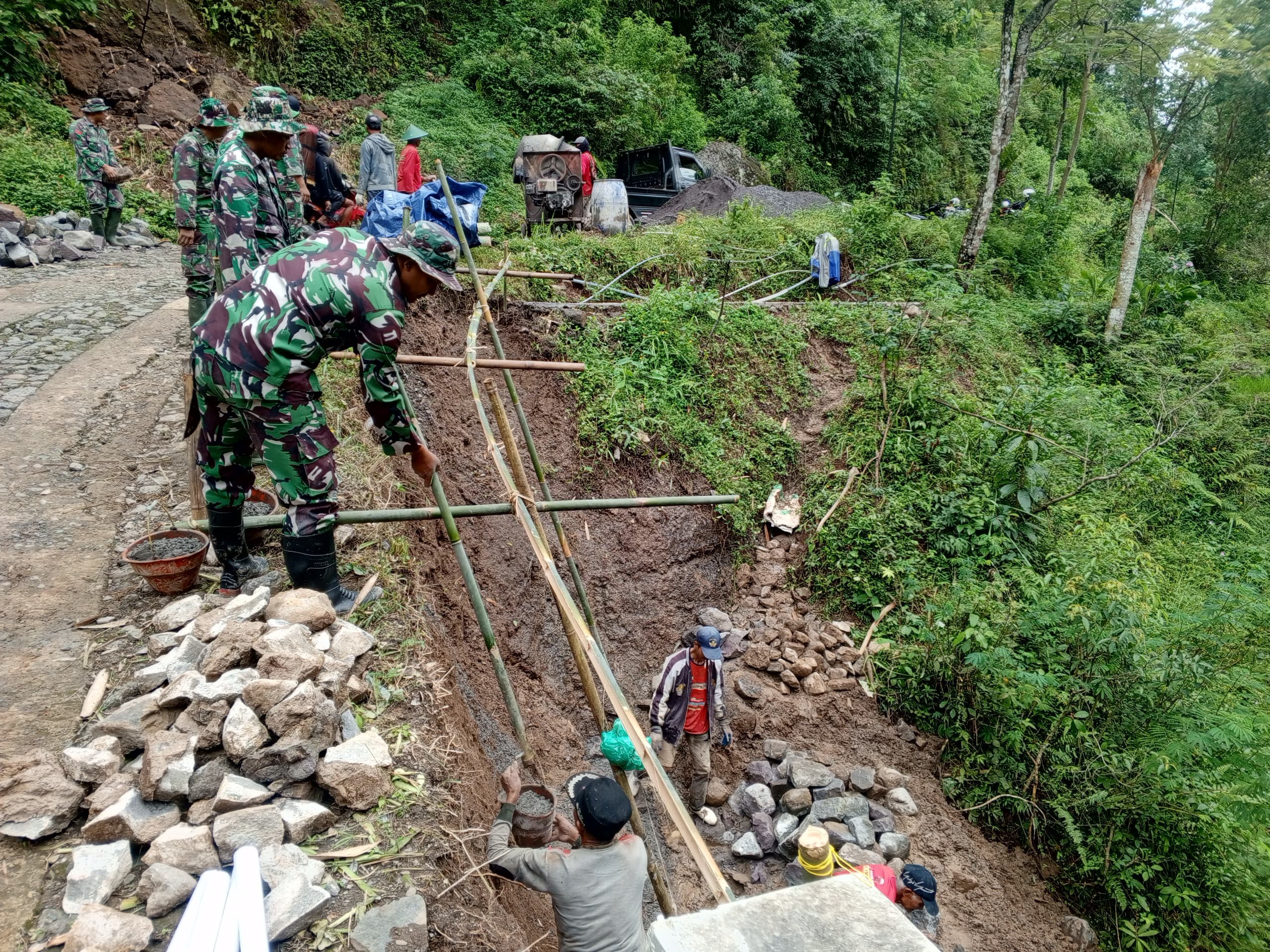 WONOGIRI, JATENG – MEDIA ONLINENEWS.ID//Di tengah sunyi wilayah terpencil yang selama ini luput dari sorotan, derap langkah prajurit TNI berpadu dengan keringat warga memecah keheningan. Melalui program TMMD, pembangunan talud dikebut tanpa mengenal lelah. Batu demi batu disusun, tanah digali, dan semen diaduk, Anggota Satgas TMMD Reguler ke-127 menunjukkan semangat juang yang tinggi dalam melaksanakan pembangunan talud untuk penahan jalan. Di Desa Kembang Kec. Jatipurno Kab. Wonogiri, Kamis (12/2/2026).