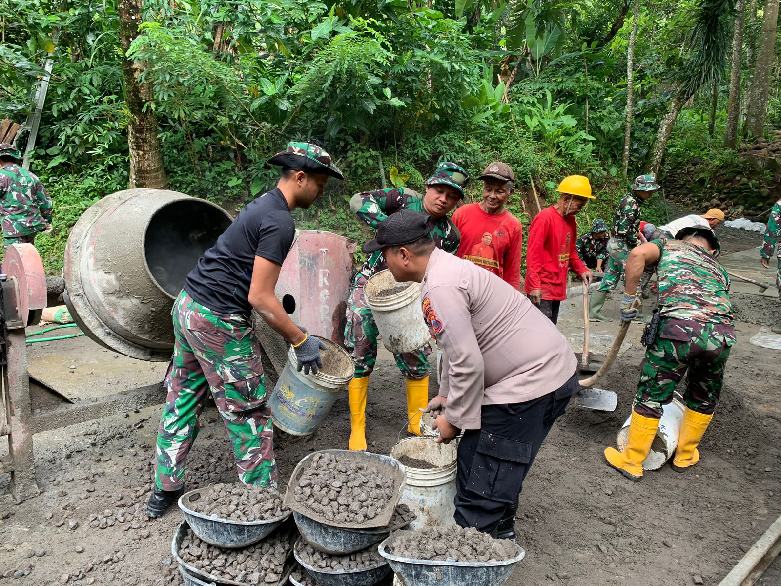 Pada Sabtu (14/2/2026), TNI-POLRI bergabung bersama warga Desa Kembang, Kecamatan Jatipurno, Kabupaten Wonogiri, terlihat bahu-membahu menyelesaikan rabat jalan cor beton. Gemuruh suara mesin pengaduk material semen, split Dan pasir di aduk jadi satu lantas di usung puluhan angkong saling mengantri yang di lakukan oleh TNI-POLRI tanpa terkecualian, semuanya saling bahu membahu.
