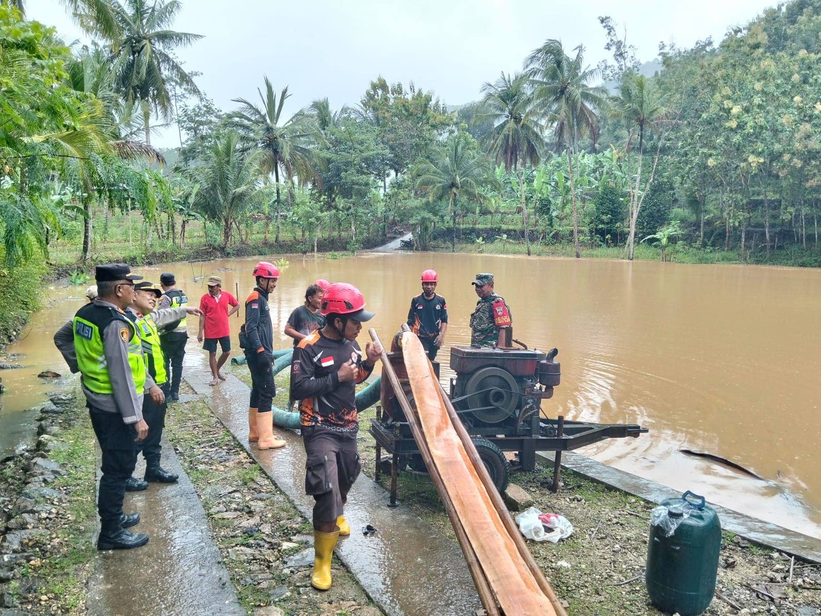 Kapolsek Pracimantoro AKP Bunal Eko Trilaksono memimpin langsung kegiatan bersama personel Polsek Pracimantoro, BPBD Kabupaten Wonogiri, Koramil 13 Pracimantoro, relawan Prabu, pemerintah desa, serta masyarakat setempat. Petugas BPBD membawa genset penyedot air, sementara aparat TNI-Polri dan warga bergotong royong membuat saluran untuk mengalirkan air menuju jalur irigasi terdekat.