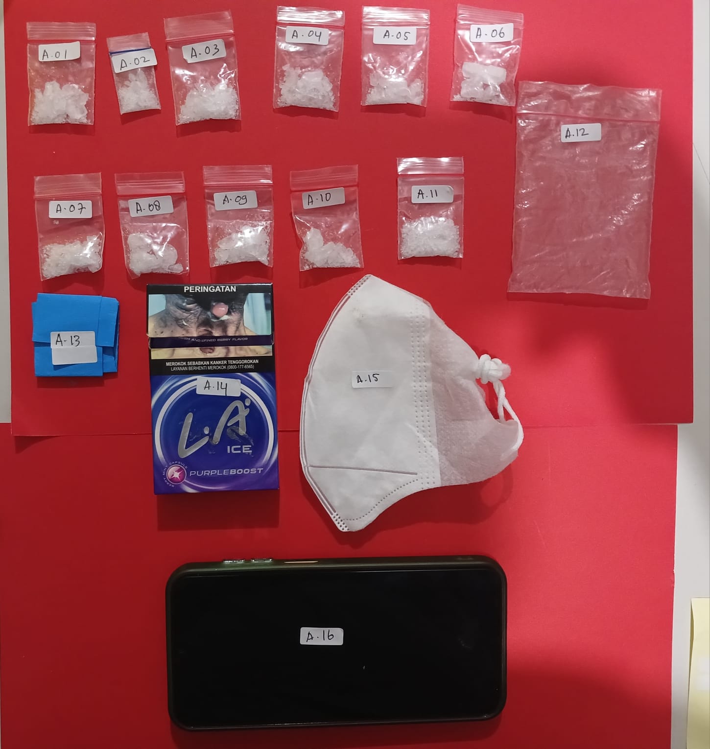 Adapun barang bukti yang diamankan meliputi 11 paket yang diduga sabu, satu lembar plastik klip kosong, satu lembar kertas warna biru, satu bungkus rokok LA Ice War warna ungu, satu masker putih, serta satu unit handphone Samsung A15 warna kuning.