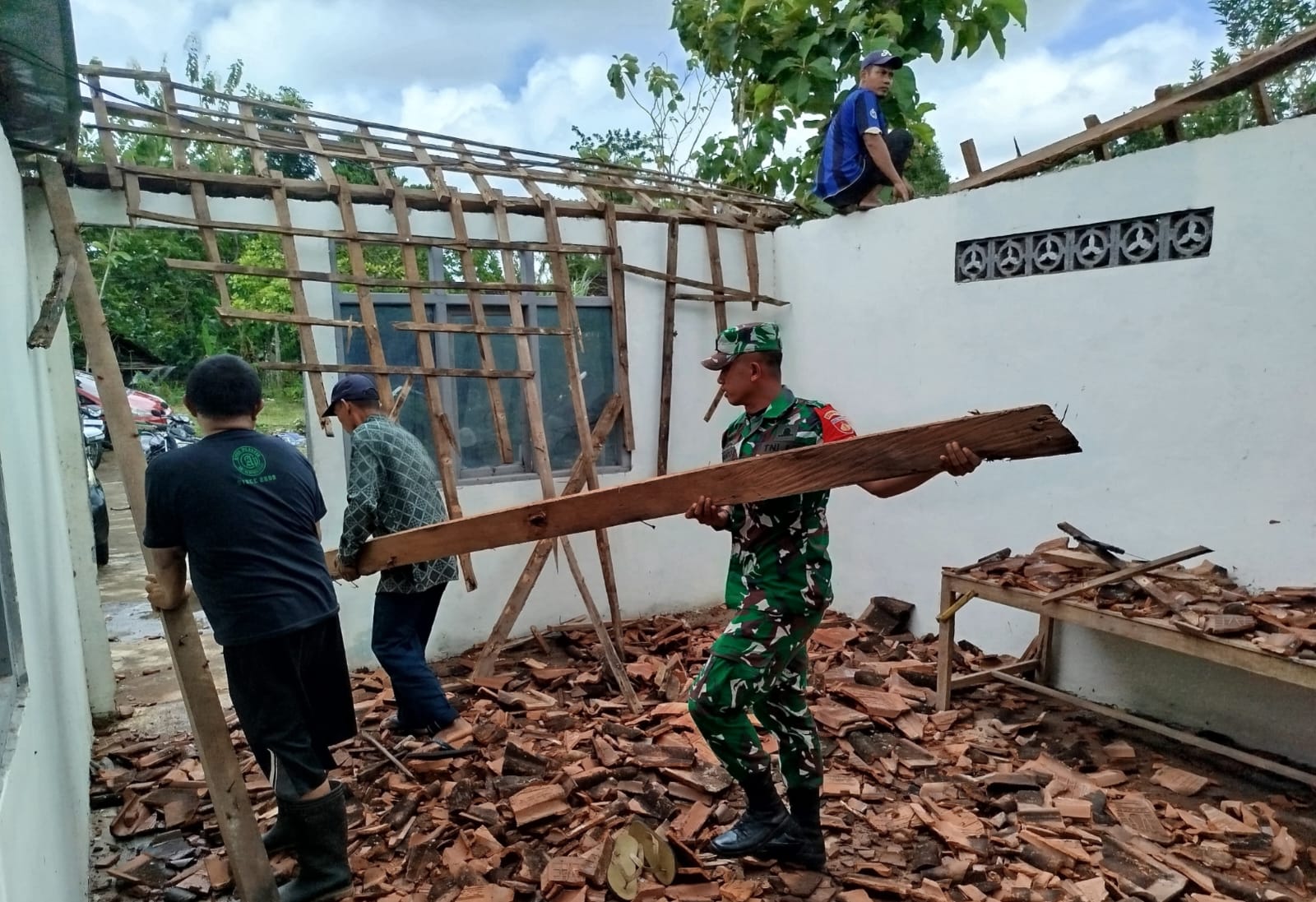 Fokus utama pembersihan adalah tumpukan genteng yang roboh akibat terjangan angin kencang yang sempat melanda wilayah tersebut.
