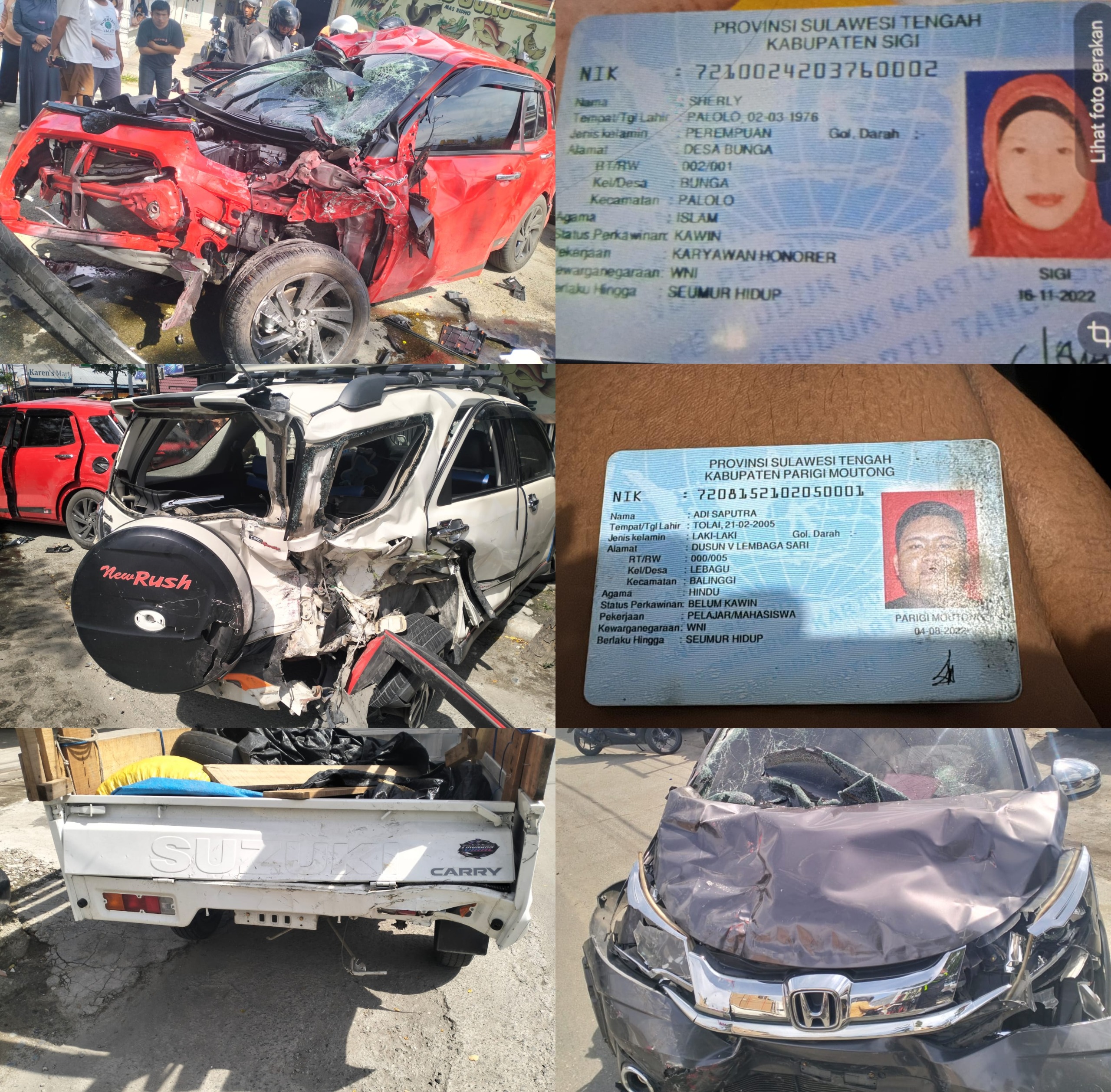 Korban meninggal dunia adalah Sherly (50), warga Desa Bunga, Kecamatan Palolo, Kabupaten Sigi, pengemudi mobil Toyota Raize merah DN 1504 XY. Ia meninggal dunia saat dirawat di RSUD Undata Palu akibat luka robek di bagian kepala. Pengemudi Honda BRV DN 1996 ND, Ines Imaniar Yulia (34), warga Jalan Bouraq, Kelurahan Lasoani, Kota Palu, mengalami luka ringan dan dirawat di Rumah Sakit Samaritan Palu.