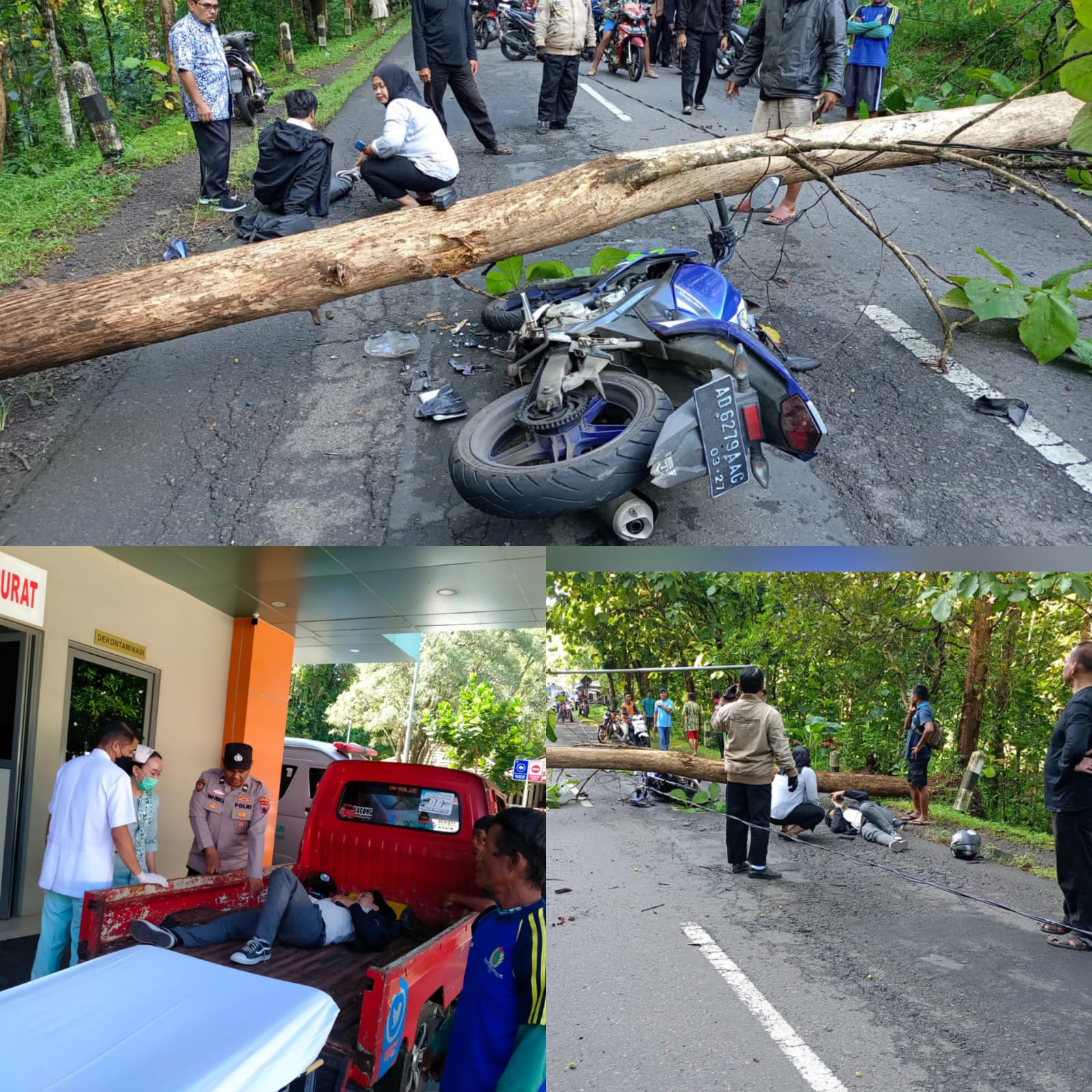 “Karena jarak yang sudah dekat, pengendara tidak sempat menghindar sehingga menabrak batang pohon tersebut dan mengalami luka-luka,” jelas Kapolsek.