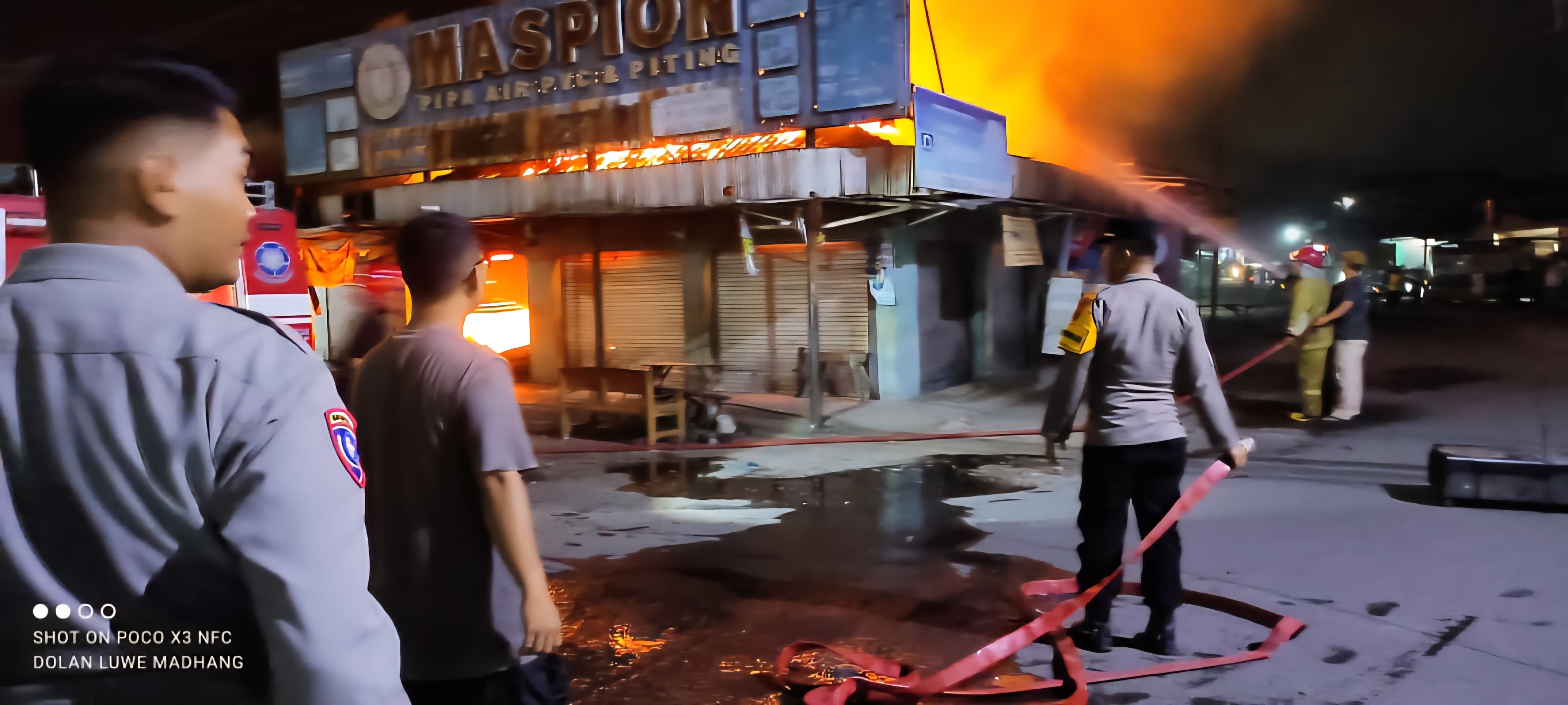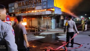 WONOGIRI, JATENG – MEDIA ONLINENEWS.ID//Kebakaran hebat melanda deretan toko di kawasan Eks Stasiun Baturetno, tepatnya di barat Pasar Bung Karno, Kecamatan Baturetno, Kabupaten Wonogiri, pada Selasa (17/3/2026) malam sekitar pukul 20.00 WIB. Peristiwa ini menghanguskan sedikitnya tujuh unit usaha milik warga.