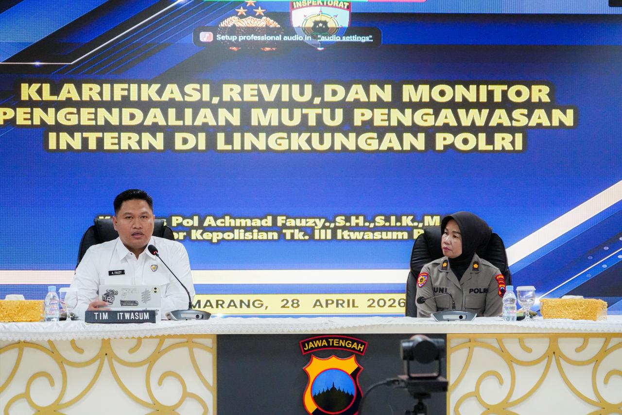 SEMARANG,JATENG – MEDIA ONLINENEWS.ID//Dalam rangka meningkatkan kualitas pengawasan dan akuntabilitas di lingkungan Polri, Polda Jateng menerima kunjungan Tim Itwasum Polri untuk melaksanakan kegiatan klarifikasi, reviu, dan monitoring pengendalian mutu pengawasan intern di lingkungan Polri Tahun Anggaran 2025. Kegiatan yang dilaksanakan pada Selasa, (28/4/2026) di Aula Mapolda Jateng ini bertujuan untuk memastikan bahwa proses audit dan pengawasan yang dilakukan di Polda Jateng berjalan sesuai dengan standar yang telah ditetapkan, serta memastikan kesesuaian antara temuan audit dan tindak lanjut yang diperlukan.